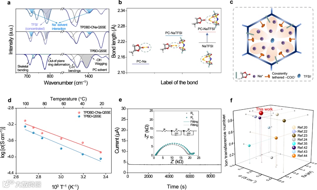图5. COF-QSSE的物理化学性质和Na+传导。a制备的TPDBD-CNa-QSSE、TPBD-QSSE和PC溶剂的FTIR光谱(在 0.02 mA cm−2和25 ± 1 °C下,在Na||Na 电池中循环超过20个循环)。b PC-Na 和PC-NaTFSI 中的Na-O 键长。c PC、Na+ 和TFSI− 在TPDBD-CNa中的分布示意图(白色、蓝色、灰色、青色、黄色、紫色和红色球体分别表示氢、氮、碳、氟、硫、钠和氧)。d TPDBD-CNa-QSSE 和TPBD-QSSE 的离子电导率的Arrhenius图。e Na|TPDBD-CNa-QSSE|Na对称电池的电流-时间曲线(插图显示了初始和稳定状态下的EIS以及相应的等效电路模型)。f已报道的Li+/Na+ SSE的典型性能比较(离子电导率的数值和测试温度见补充表4)。