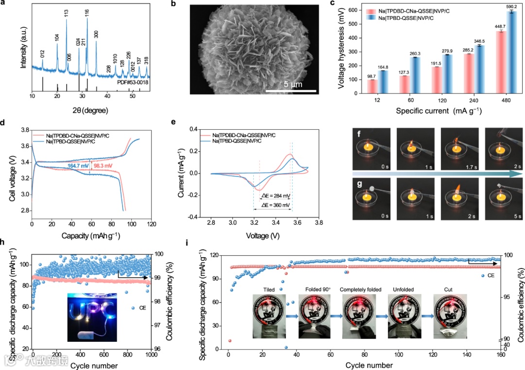 图8. Na|QSSE|NVP/C电池和安全特性。a NVP/C 的 XRD图。b NVP/C 的 SEM图像。c不同比电流下的电压滞后柱状图(误差棒表示50 mAh g−1附近充放电平均电压的标准差)。d Na|TPDBD-CNa-QSSE|NVP/C 和Na|TPBD-QSSE|NVP/C电池在 12 mA g−1下的充电/放电电压曲线。e Na|TPDBD-CNa-QSSE|NVP/C 和Na|TPBD-QSSE|NVP/C电池在 0.1 mV s−1时的CV 曲线。f TPDBD-CNa-QSSE 的燃烧行为。g溶剂渗透玻璃纤维隔膜的燃烧行为。h Na|TPDBD-CNa-QSSE|NVP/C电池在 60 mA g−1下的长循环稳定性(插图显示了点亮LED 的照片)。i Na|TPDBD-CNa-QSSE|NVP/C 铺展的软包电池在12 mA g−1下循环160 次的循环性能。插图显示了由QSSE 软包电池供电的LED,处于“铺展”、“折叠90°”、“完全折叠”、“展开”和“切割”等不同状态。