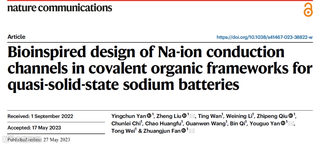 近日,来自中国石油大学(华东)的范壮军教授、刘征博士及燕友果教授,在国际知名期刊Nature Communications上发表题为“Bioinspired design of Na-ion conduction channels in covalent organic frameworks for quasi-solid-state sodium batteries”的文章。该文章以细胞膜的生物离子通道为灵感,开发了一种–COO– 修饰的共价有机框架(COF)作为钠离子准固态电解质(QSSE)。研究表明,这种准固态电解质具有由相邻的–COO–基团和COF内壁形成的亚纳米Na+传输区(6.7-11.6 Å),可实现Na+沿着亚纳米尺寸的电负性区域传输。