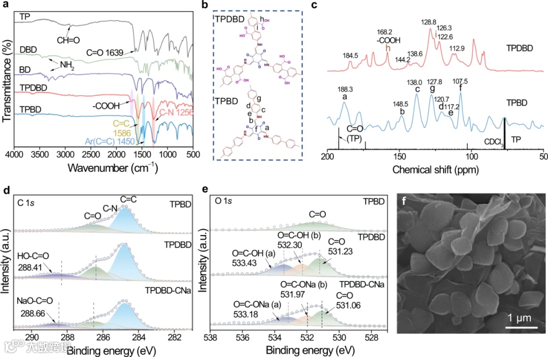 图2. 共价有机框架材料的结构表征。a TPBD、TPDBD、BD、DBD和 TP的 FTIR光谱。b TPBD 和 TPDBD的部分单元结构。c TPBD、TPDBD和 TP的 13C CP-MAS 固态 NMR光谱。d TPBD、TPDBD和 TPDBD-CNa的XPS C 1s光谱。e TPBD、TPDBD和 TPDBD-CNa的XPS O 1s光谱。f TPDBD的SEM图像。