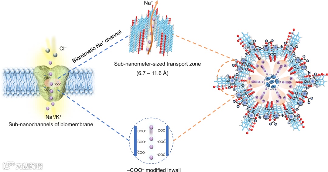 图1. 结构设计。由相邻的–COO–基团和COF 内壁构成的仿生亚纳米级Na+传输区。紫色和红色球体以及青色椭圆分别表示钠和氧以及TFSI–,青色棒和分子结构表示共价有机框架)。