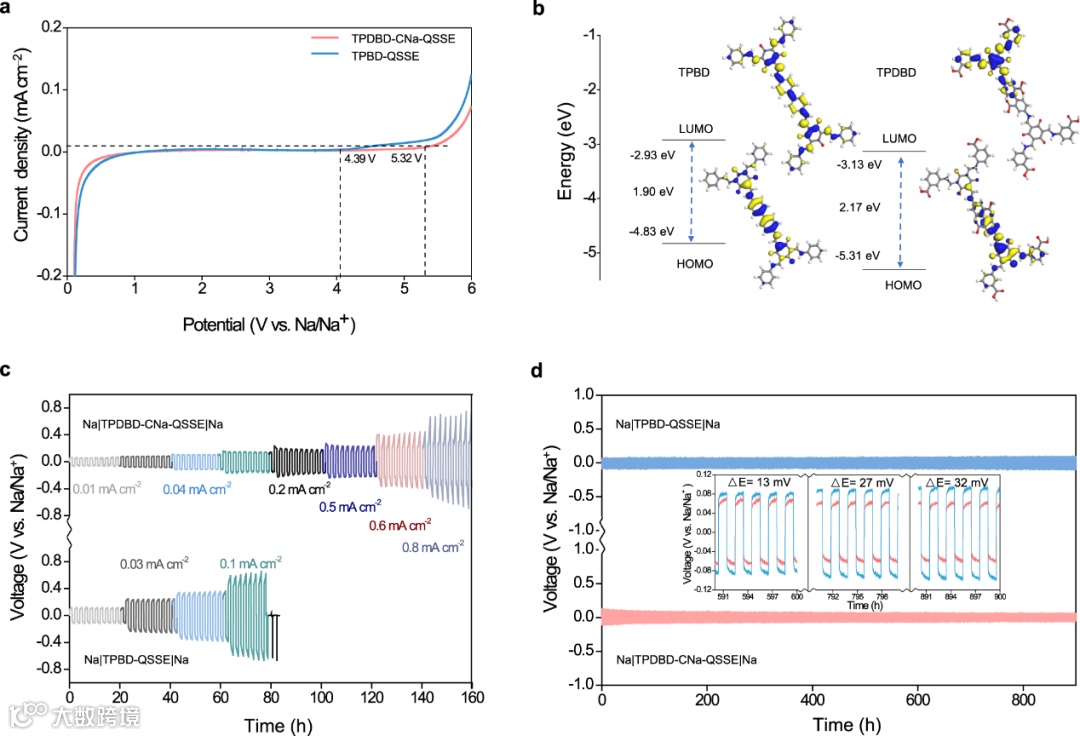图6. COF-QSSE的电化学窗口和Na沉积/溶出。a SS|TPBD-QSSE|Na 和SS|TPDBD-CNa-QSSE|Na不对称电池的LSV 图。b基于DFT计算出的TPBD 和TPDBD 的HOMO 和LUMO 值。c在25±1 °C 和0.01、0.03、0.04、0.1、0.2、0.5、0.6和 0.8 mA cm−2下,Na|QSSE|Na的Na沉积/溶出的倍率性能。d Na|QSSE|Na 在电流密度为0.01 mA cm−2和 25 ±1 °C下沉积/溶出曲线(插图显示时间分段的沉积/溶出曲线)。