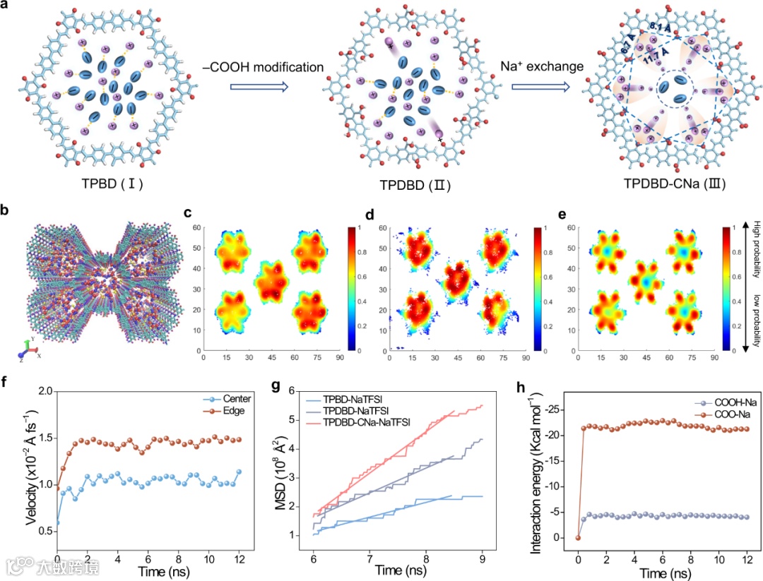 图4. Na+传输机制。a TPBD、TPDBD和 TPDBD-CNa中Na+和TFSI-的分布示意图(紫色和红色球体以及青色椭圆分别表示钠、氧和TFSI–,青色棒表示共价有机框架)。b TPDBD-CNa-NaTFSI 的MD模拟示意图(白色、蓝色、青色、粉红色、黄色、紫色和红色球体分别表示氢、氮、碳、氟、硫、钠和氧)。TPBD-NaTFSI (c)、TPDBD-NaTFSI (d) 和TPDBD-CNa-NaTFSI (e) 的Na+密度分布(红色区域表示Na+ 的概率最高)。f TPDBD通道边缘和中心的Na+传输速度。g三种结构中Na+随时间变化的MSD 结果。h TPDBD 中 –COOH/–COO−基团与Na+ 之间的相互作用能。