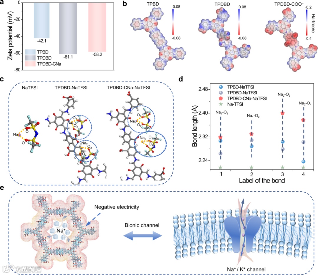 图3. 仿生Na+通道。a Zeta 电位值。b TPBD、TPDBD和 TPDBD-COO– 的静电势图(白色、蓝色、灰色和红色球体分别表示氢、氮、碳和氧)。c NaTFSI 与 TPDBD和 TPDBD- COO–之间的优化结构示意图(白色、蓝色、紫色、灰色和红色球体分别表示氢、氮、钠、碳和氧)。d NaTFSI 和TPBD、TPDBD和TPDBD-COO– 之间的键长。e TPDBD-CNa 中的仿生通道示意图(红色球体表示氧气,青色棒表示共价有机框架)。