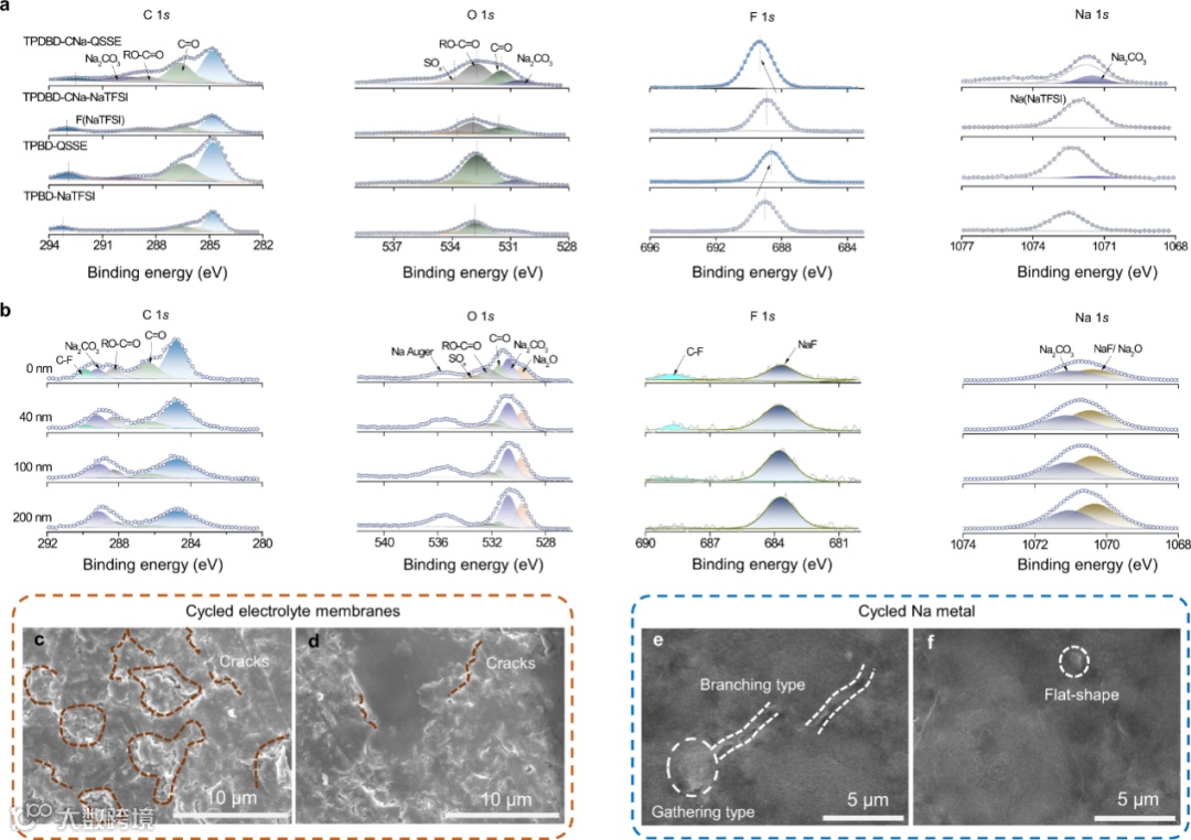 图7. 非原位XPS 和SEM 表征。a TPDBD-CNa-QSSE/TPBD-QSSE 在Na||Na 电池中0.02 mA cm−2和 25 ± 1 °C下超过20 个循环以及TPDBD-CNa-NaTFSI/TPBD-NaTFSI 的XPS C 1s、O 1s、F 1s和 Na 1s。b Na|TPDBD-CNa-QSSE|Na超过 20个循环的金属钠深度剖面的XPS C 1s、O 1s、F 1s和 Na 1s。TPBD-QSSE (c) 和TPDBD-CNa-QSSE (d) 循环膜在0.02 mA cm−2和25 ± 1 °C下超过20 个循环的SEM 图像。TPBD-QSSE (e) 和TPDBD-CNa-QSSE (f)的循环钠金属在0.02 mA cm-2和 25 ± 1 °C下超过20 个循环的SEM 图像。