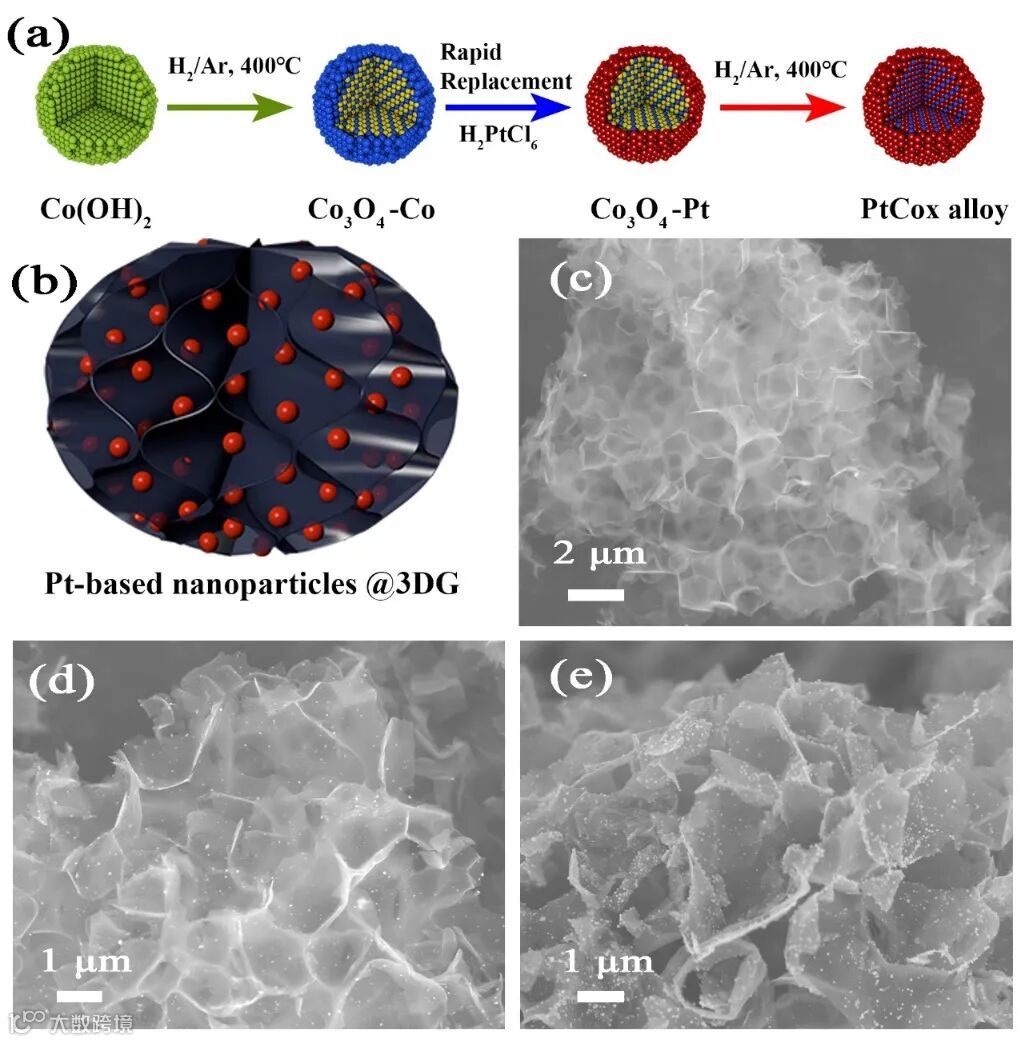 图1. (a) PtCo纳米颗粒的形成示意图; (b) Pt基纳米颗粒锚定在3DG上的示意图; (c) 三维石墨烯的扫描电镜图;(d) Co3O4-Pt@3DG的扫描电镜图;(e) PtCo@3DG的扫描电镜图。