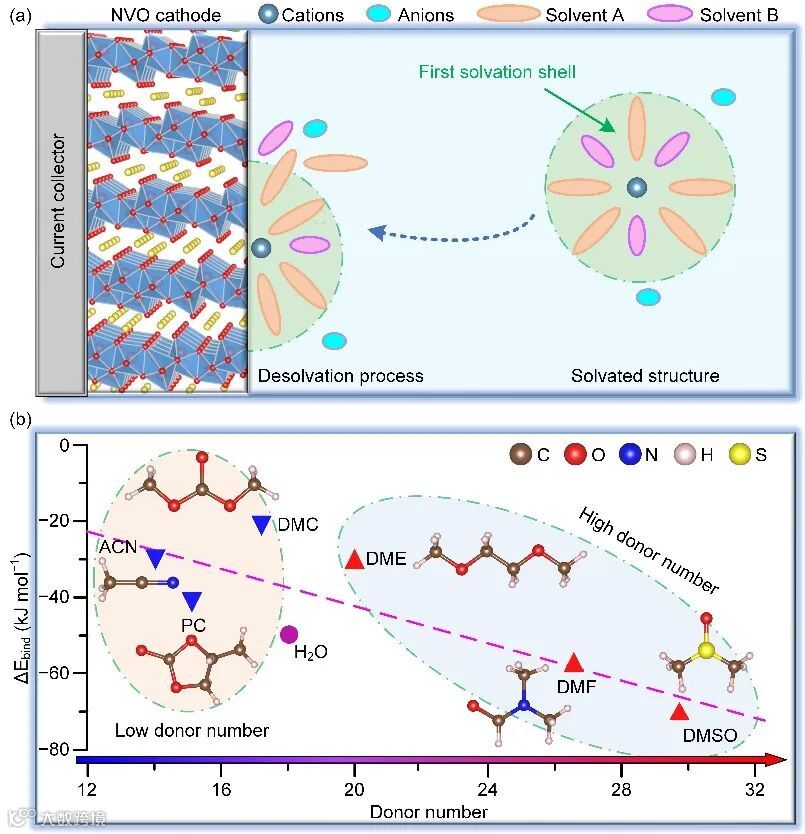 图1:a)第一溶剂化壳体结构和界面上的脱溶化过程示意图。b)计算所得水和不同DN值有机溶剂的1:1(Ca2+:溶剂分子)团簇的结合能。