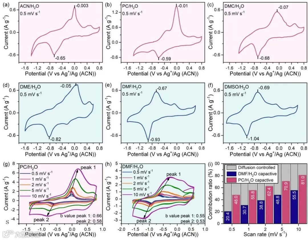 图4. 在不同有机-水杂化电解质体系下的循环伏安曲线和赝电容贡献比率图