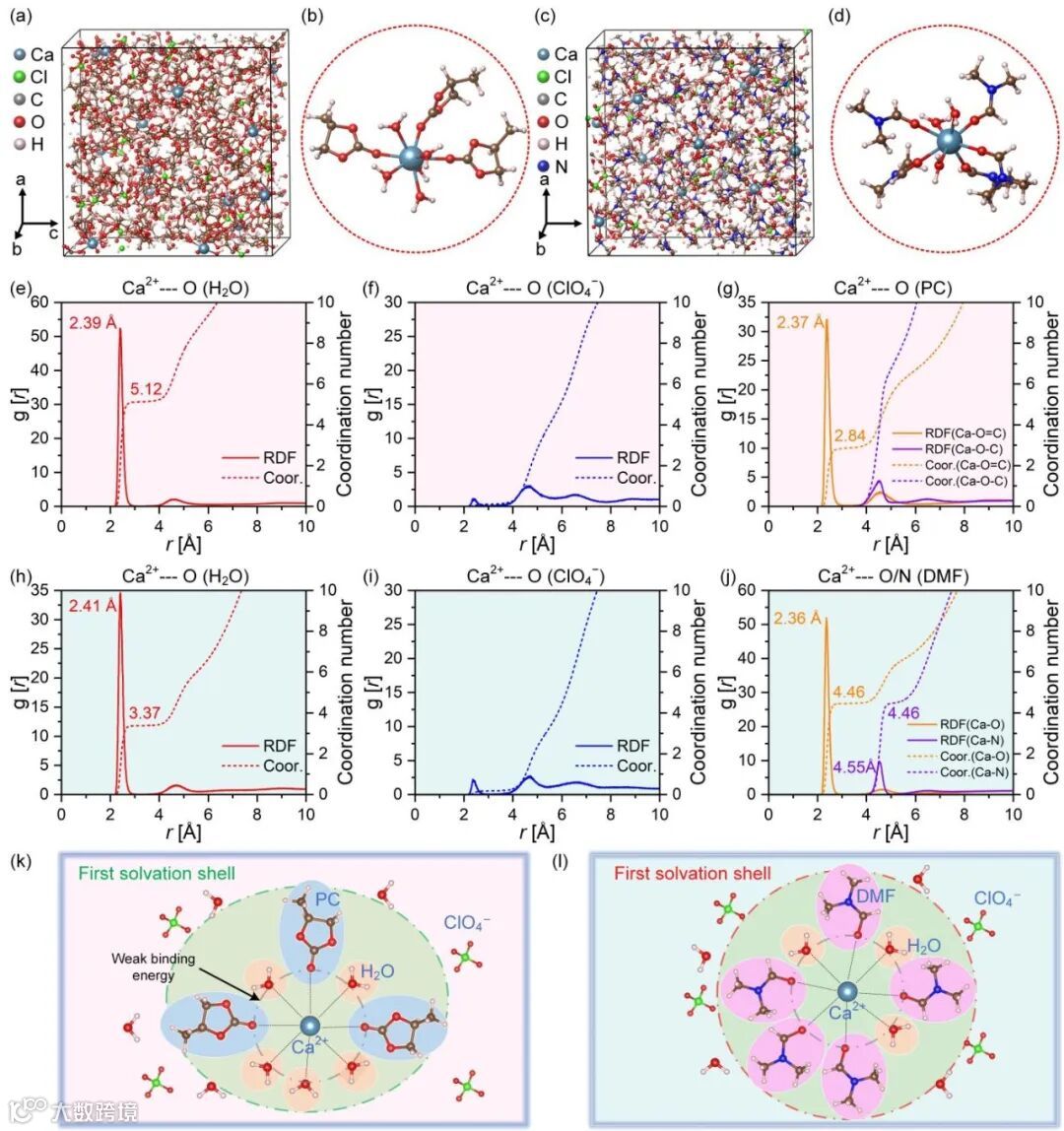 图3:在PC/H2O和DMF/H2O杂化电解质中Ca2+离子溶剂化结构的分子动力学模拟结果和第一溶剂化壳层示意图