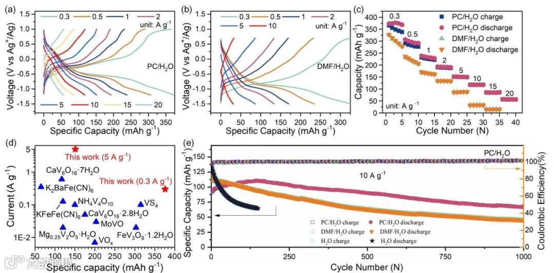 图5. 使用PC/H2O和DMF/H2O杂化电解质的钙离子电池的电化学性能