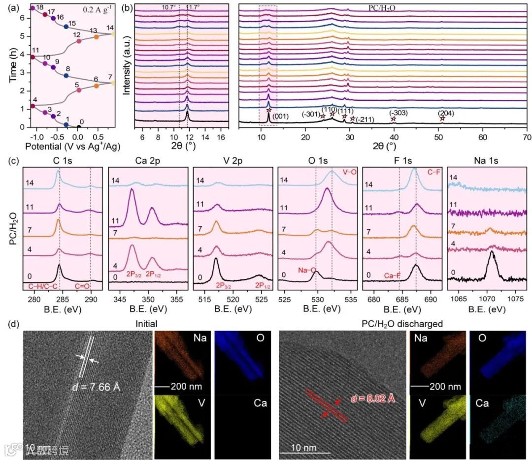 图6. PC/H2O杂化电解质中NVO阴极的结构表征