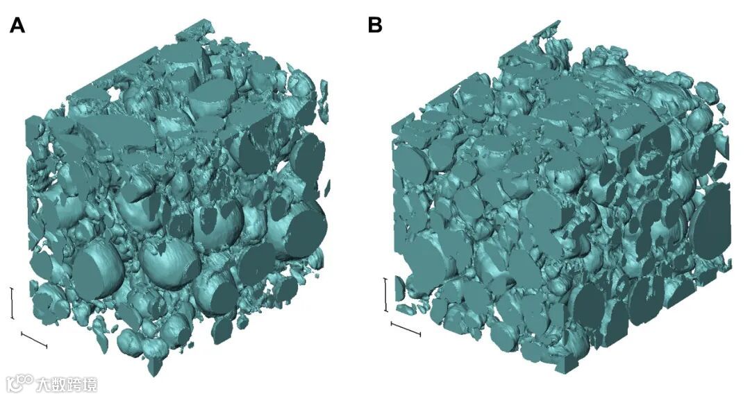 图3. 使用纳米X射线断层技术还原的3D NMC 正极结构。