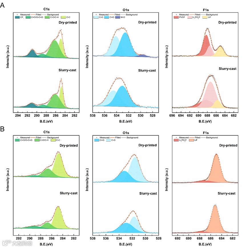 通过高分辨TEM测试,可以发现循环过后湿法NMC正极表面晶格出现相变,由层状转化为不规则尖晶石状,从而导致了循环性能的衰减。得益于粘结剂/导电剂的表面覆盖,干法电极中的NMC颗粒表面依旧保持了较好的层状结构。从循环后电极的XPS表面分析也可以看出,干法电极具有更稳定的CEI/SEI层,有助于电池的循环稳定性。
