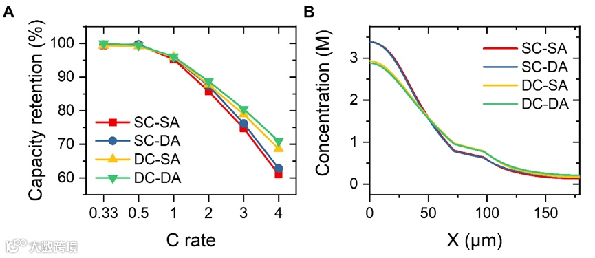 图6. 干法/湿法电极的伪2D 仿真模拟。