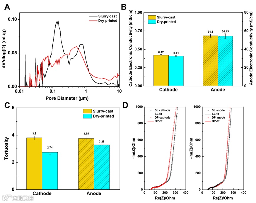 图2. 干法和湿法工艺电极的孔径分布,电导率和迂曲度对比。