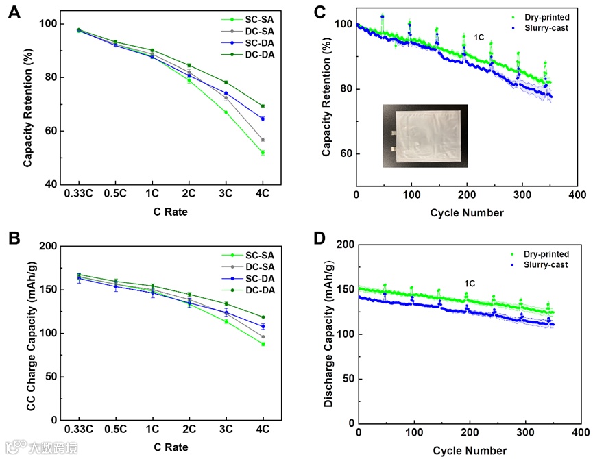 图4. 干法/湿法电极软包电池倍率,循环性能。