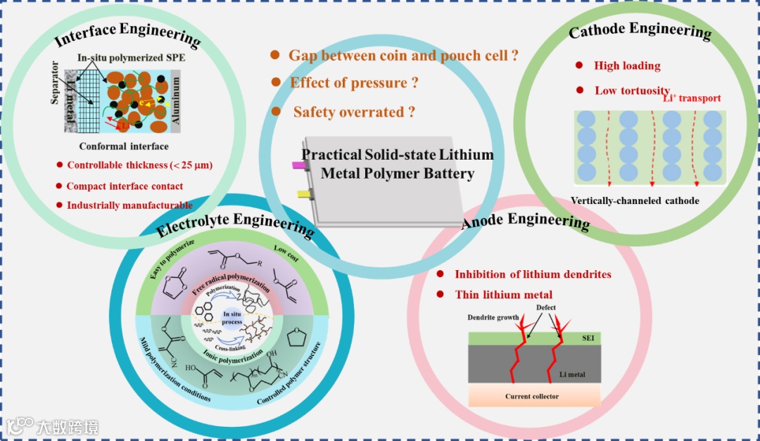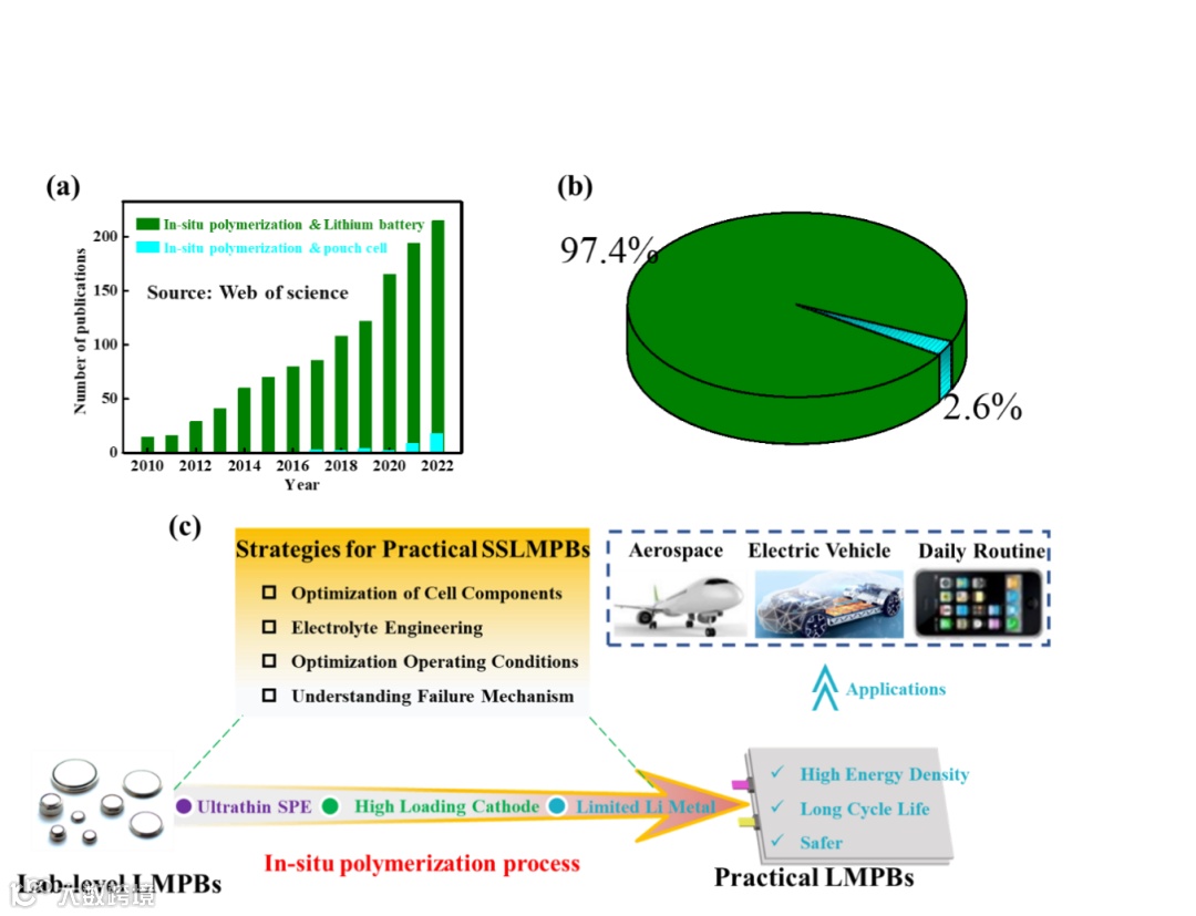 在此,有必要对原位工艺制造实际的SSLMPBs的挑战和设计原则进行客观的回顾,以提供全面的理解,并为实际的SSLMPBs应用提供战略指导。然而,现有的同类课题综述大多集中在总结各种聚合物分子设计在提高原位合成SPE物化性能方面的作用,如:离子电导率、Li+转移数等,突出了聚合物设计和调控在分子水平上的优势。诚然,这些对原位合成的SPEs极为重要,但忽略了原位工艺在实际应用中的另一个关键问题,即原位聚合工艺制造实际的SSLMPBs的评论和加工方法的重要性,这对电极电解质界面、相间和电化学性能有很大的影响,但却很少被评述,未能让读者全面了解原位工艺所面临的挑战和未来发展趋势。因此,作为对现有综述一种补充,我们从实际的ssLMPBs电池制造/加工的角度来理解原位聚合工艺研究的点点滴滴是至关重要的。