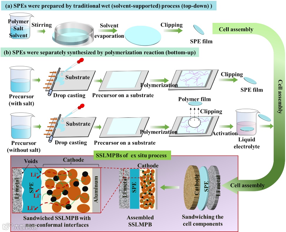 传统方法制造ssLMPBs(非原位工艺)的包括多个步骤,其中SPE单独制备为自支撑膜,随后夹在电极之间,组装成ssLMPBs。制备的SPE膜用于三明治结构的电池中,它除了充当电解质角色还起到额外的隔膜作用。在典型的湿法(溶剂支持的)工艺中,在有或没有盐和其他固体添加剂存在的情况下,将聚合物溶解在合适的溶剂中(自上而下法)。真空干燥和蒸发溶剂后,浇铸膜可以直接用作SPE(如果存在盐)或通过LE活化。此外,通过热/光诱导聚合单独制备sPE膜以及随后组装LMPB电池,(从下至上法,)。这里,主要要求是含有可聚合单体(也包括低聚物)、导电盐和合适的聚合引发剂。随后,将前体浇铸在模具上,在聚合过程之后,获得具有所需厚度的sPE膜。在许多情况下,在不存在电解质组分(盐和增塑剂)的情况下,由前体制备聚合物膜,然后在LE中通过溶胀(浸泡)过程进行活化,以产生离子导电SPE。这种非原位工艺制备的ssLMPBs通常具有不满意的固/固界面相容性和低离子导电性,且制备的SPE厚度过大难以是现实高能量密度,此外难以与先流行锂电池生产工艺相匹配。