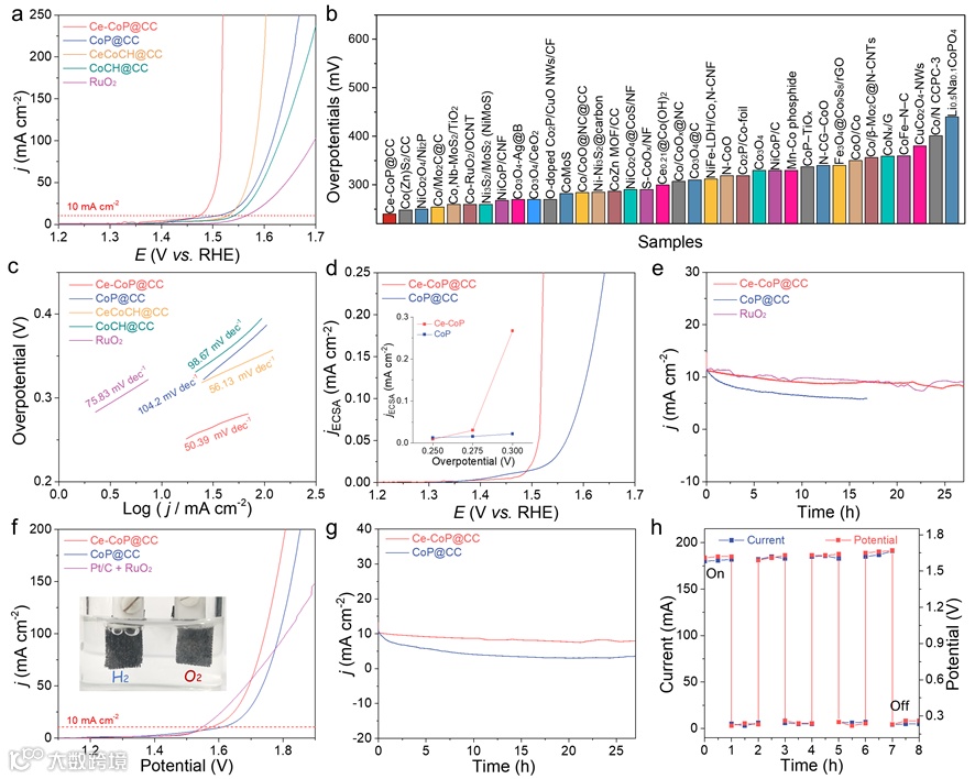 2. HER/OER性能评估:所构建的Ce-CoP@CC具有良好的双功能HER和OER性能,在10 mA cm−2下HER和OER的过电位分别为81 mV和240 mV,相较于Ce掺杂前HER过电位提升45 mV,OER提升35 mV,且表现出良好的电催化定性。
