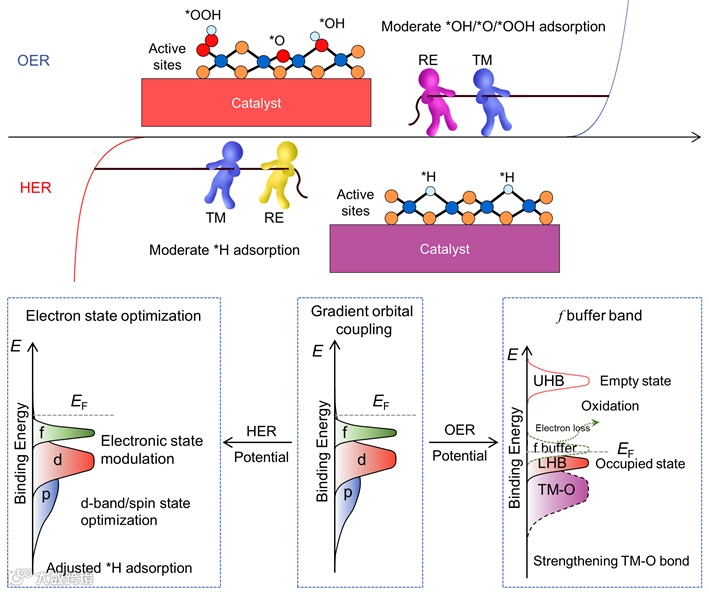 图1. RE-TM基催化剂的梯度轨道耦合提高HER/OER的机理。
