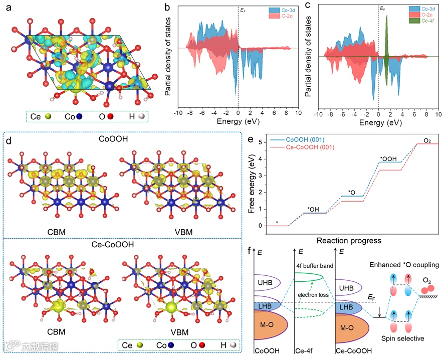 图8. OER的理论分析。(a) Ce-CoOOH的差分电荷图,黄色和青色区域分别代表电荷的积累和耗尽;(b-c) CoOOH和Ce-CoOOH的PDOS分析;(d) 利用VBM和CBM对CoOOH和Ce-CoOOH进行轨道群分析;(e) CoOOH和Ce-CoOOH的OER的自由能图;(f) 以Ce-4f作为Ce-CoOOH中O2形成的缓冲带的可能机制。
