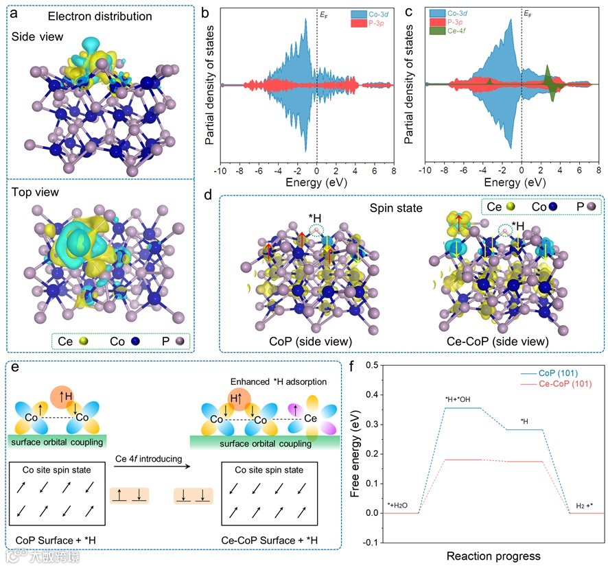 图7. HER的理论研究。(a) Ce-CoP的差分电荷图;(b-c) CoP和Ce-CoP的PDOS分析,黄色和青色区域分别代表电荷的积累和失去;(d) CoP (101) + *H和Ce-CoP (101) + *H的自旋密度布居;(e) Ce-CoP中通过Ce-4f轨道耦合的*H吸附的可能机制;(f) 在CoP和Ce-CoP的HER自由能图。