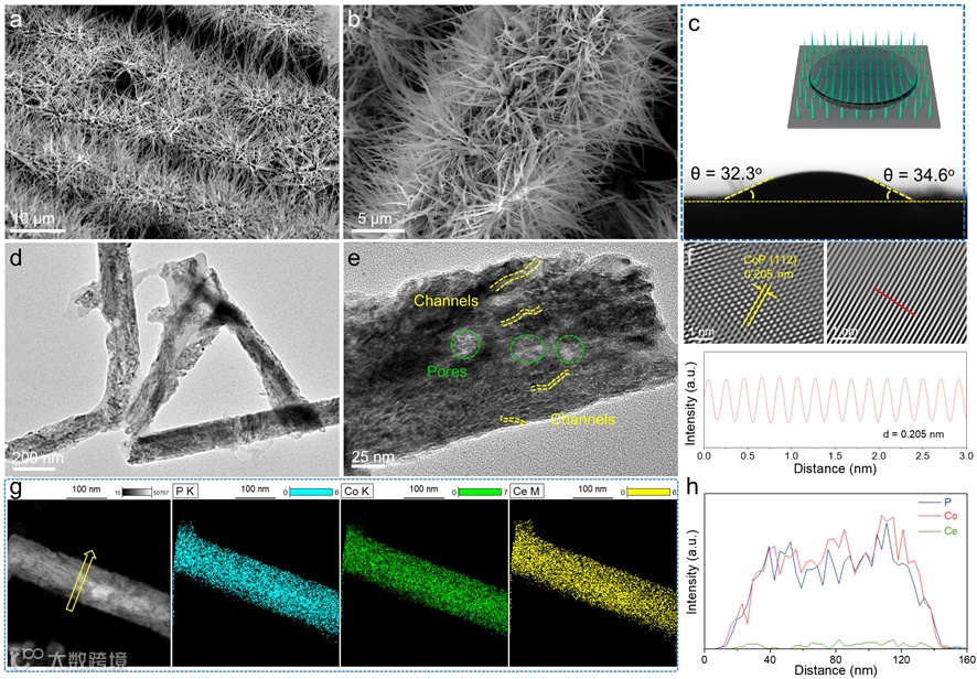 图3. Ce-CoP@CC的形貌和元素表征:(a-b) SEM图像;(c)水接触角;(d-e)透射电镜图像;(f)消噪后的HRTEM图像和Moré图像;(g) EDS mapping图像;(h) 线扫描信号。