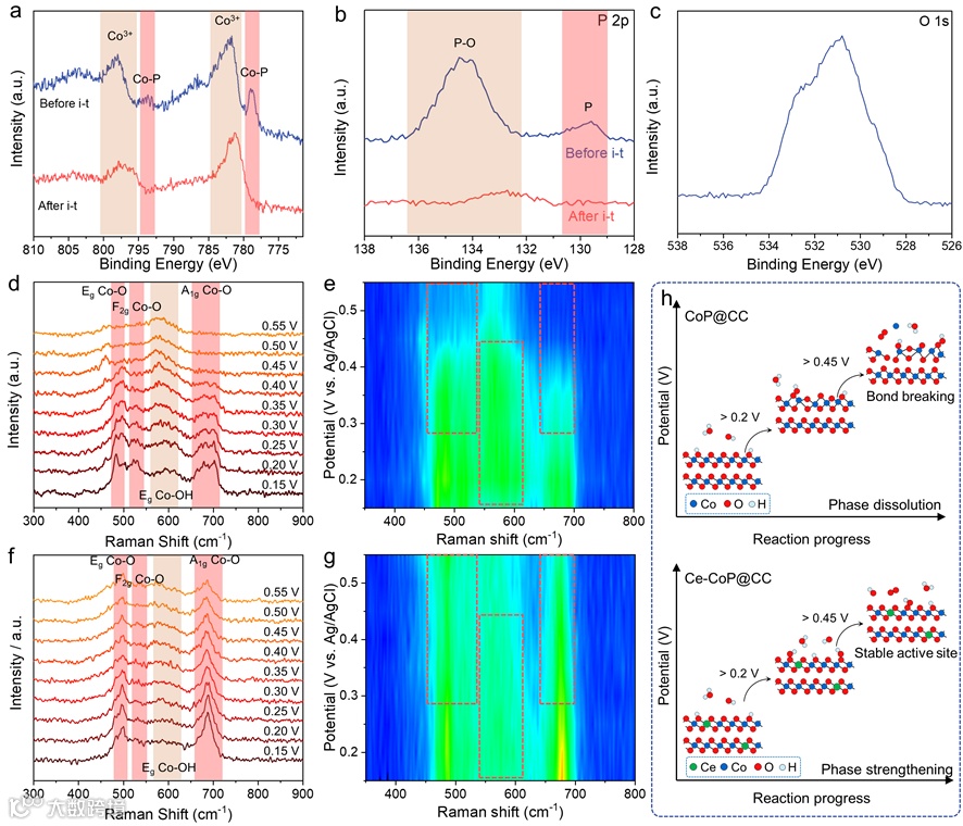 图6. OER的电催化活性位点探索。Ce-CoP@CC在i-t测试前后的XPS光谱:(a) Co 2p光谱和(b) P 2p光谱;(c) 经i-t测试后Ce-CoP@CC的O 1s频谱;(d) 原位拉曼图和(e) CoP@CC对应的反图;(f) 原位拉曼图和(g) Ce-CoP@CC对应的二维等高线图;(h) CoP@CC和Ce-CoP@CC表面演化示意图比较。
