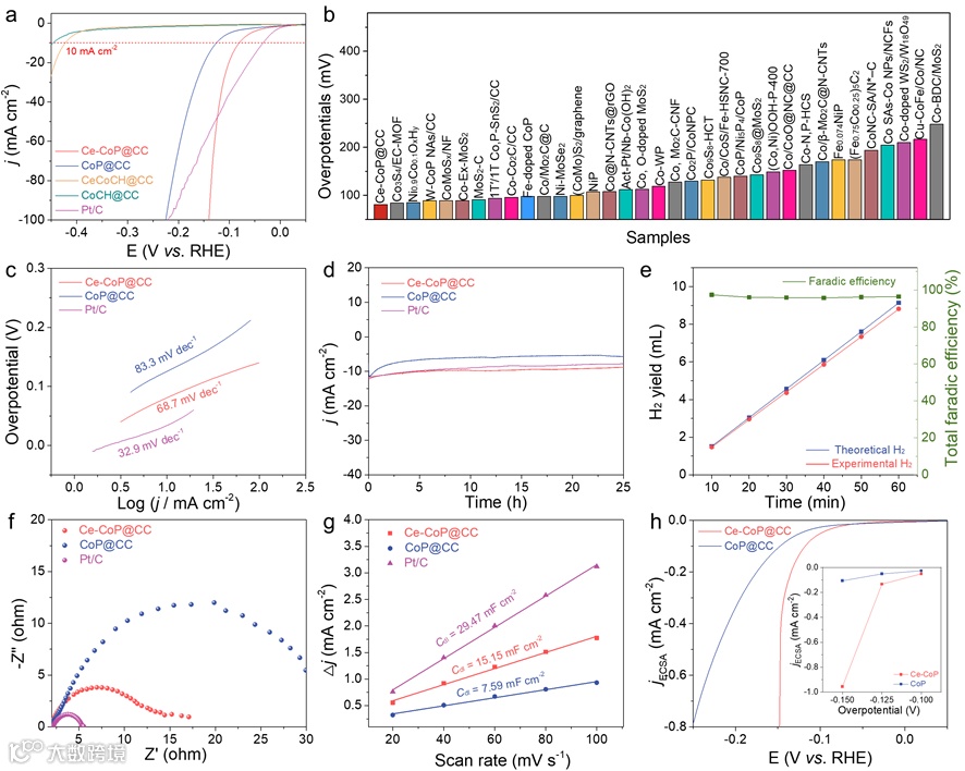 稀土Ce引入导致CoP过电位降低45 mV,具有更小的Tafel斜率,HER活性优于近年来报道的其他过渡金属基催化剂。Ce-CoP还表现出良好的稳定性、接近100%的选择性。