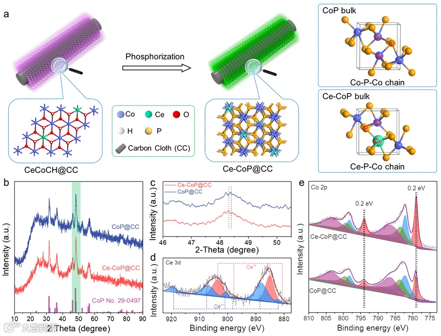 图2. (a) Ce-CoP@CC的合成示意图与结构单元对比;(b) CoP@CC与Ce-CoP@CC的XRD比较;(c)放大的(211)晶面比较;(d) Ce-CoP@CC的Ce 3d XPS光谱;(e) CoP@CC和Ce-CoP@CC的Co 2p XPS光谱比较。