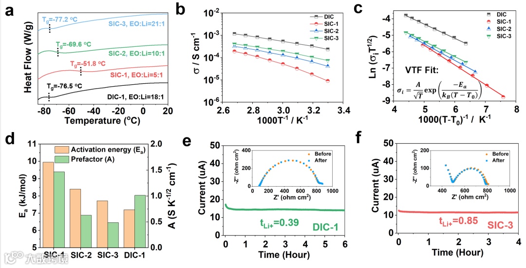 在SIC电解质中,锂离子传导机理符合Vogel–Fulcher–Tammann(VTF)方程,其中塑化剂(PEG250低聚物)的引入有效促进了高分子骨架的链段弛豫(Tg=-77.2 oC),从而显著降低了Li+传输的活化能垒(7.72 kJ/mol)。此外,由于阴离子与高分子骨架的共价键接,其Li+迁移数可达0.85,是对照双离子传导电解质(DIC)的2倍以上。