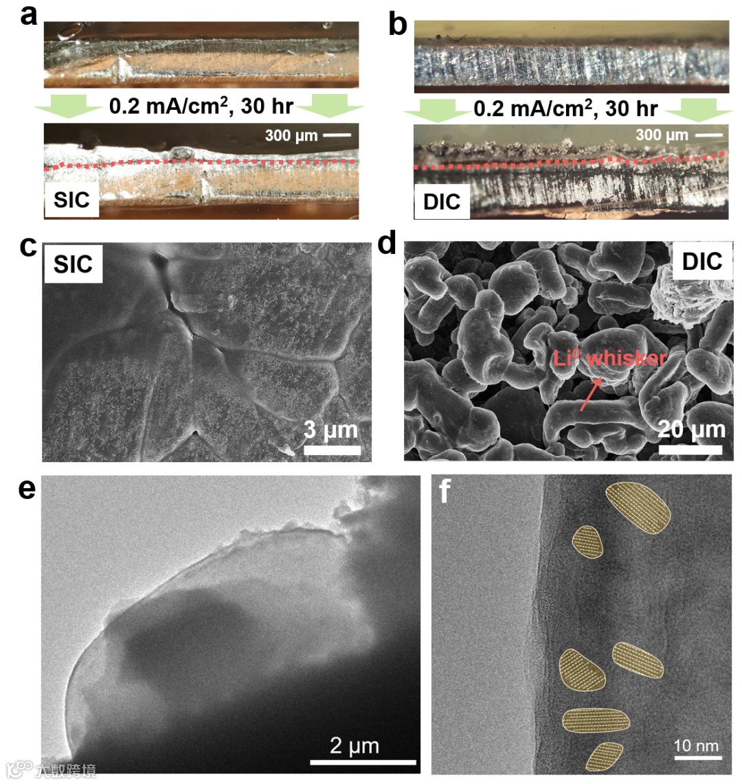 作者进一步采用原位光镜、SEM和冷冻电镜研究了锂负极的宏观尺度-微米尺度-原子尺度形貌。结果表明高Li+迁移数的SIC能实现锂金属的致密、均匀、稳定沉积。而DIC下沉积的锂金属则结构疏松多孔,且伴随着枝晶的形成。这一结果进一步解释了SIC的优异的电化学性能(高击穿电流、优异的界面稳定性)。