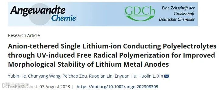 基于上述问题,加州大学尔湾分校的忻获麟团队报道了一种新型单离子传导电解质(SIC)。该工作从商业单体出发,利用UV引发的自由基聚合反应,一步法制备了高迁移数(0.85)、高离子传导率(6.3×10-5 S/cm @ RT)的聚合物电解质。相比于传统双离子传导电解质(DIC),SIC能有效促进锂金属负极的形貌稳定性,提高击穿电流密度,从而最终实现了循环寿命达4500圈的Li-LiFePO4聚合物电池。该工作发表于国际顶级期刊Angew. Chem., 第一作者为贺玉彬博士。