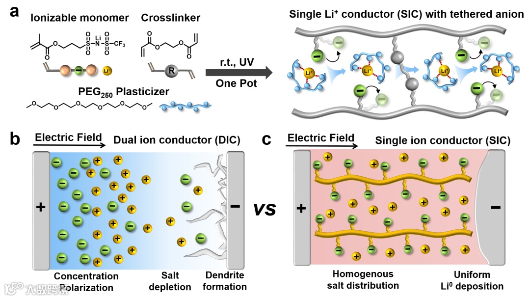 锂金属具有极高的能量密度(3680 mAh/g),被认为是下一代储能电池的理想负极材料。在锂金属电池中,传统液态电解质和聚合物电解质均为双离子导体(DIC)。其中阴离子不参与电极反应,而其在电解质内的迁移会导致低Li+迁移数、浓差极化、锂盐耗尽等问题,并诱发锂枝晶的生成。