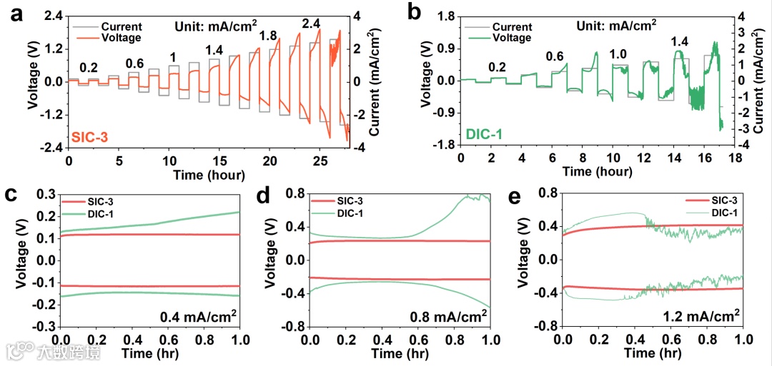 SIC较高的迁移数能有效抑制浓差极化、锂盐耗尽等问题。在Li-Li对称电池中,SIC的击穿电流可达2.4 mA/cm2。另一方面,尽管DIC具备较高的离子电导率,但是其低迁移数则导致了严重的极化过电势,最终击穿电流仅为0.8 mA/cm2。