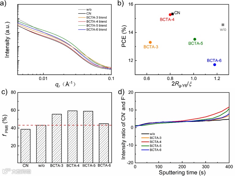 图4. 各添加剂工艺下PM6:Y6共混膜在面内方向提取的一维GISAXS信号积分强度的拟合曲线(a);共混膜的2Rg-Y6/ξ 值与相应器件PCE的关系图(b);以Cassie-Baxter公式估算的PM6表面覆盖率(c);CN-与F-随着溅射时间变化的比值曲线(d)