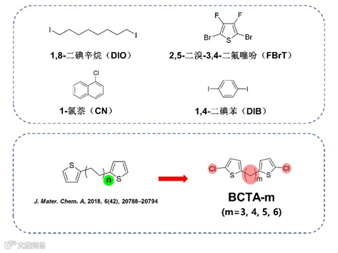 在已报道的添加剂中,卤代添加剂已被证明是对高性能PSC器件开发最为有效的添加剂种类之一。具有不同分子结构特点的非共轭溶剂添加剂(如1,8-二碘辛烷DIO)和含有共轭骨架的卤代添加剂(如1-氯萘CN,2,5-二溴-3,4-二氟噻吩FBrT,1,4-二碘苯DIB)均已被发现能有效优化活性层形貌。在本文中,提出了一种将这两类卤代添加剂的结构特点合二为一的设计策略,并基于该课题组之前开发的噻吩类烷烃添加剂(J. Mater. Chem. A, 2018, 6(42), 20788–20794),设计并合成了具有不同亚甲基数量(m)的氯代噻吩基烷烃类分子BCTA-m(m=3, 4, 5, 6)作为液体添加剂。