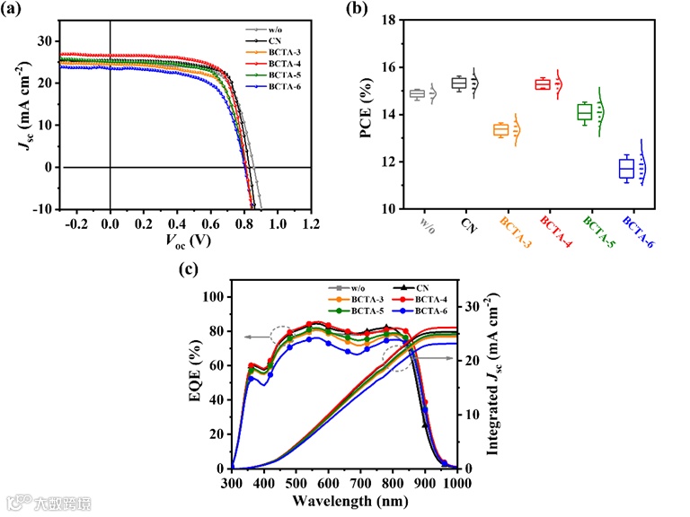 在优化添加剂加工条件后,发现BCTA-m处理的PM6:Y6器件性能随着亚甲基数(m)的增加而呈现出类正态分布的特点。以BCTA-4为添加剂制备的器件在AM 1.5G(100 mW/cm2)辐照强度下获得了优于其他三种BCTA-m添加剂的光电转换效率,并且将PCE从未使用添加剂时的15.03%略微提升至15.59%。该性能与CN添加剂制备的PM6:Y6参照器件相当(15.62%)。