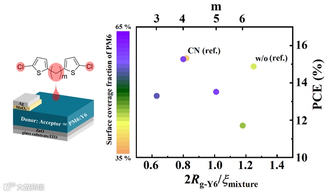 图1. BCTA-m (m=3, 4, 5, 6)添加剂优化的PM6:Y6倒置器件中器件性能与水平相分离、垂直组分分布的关系