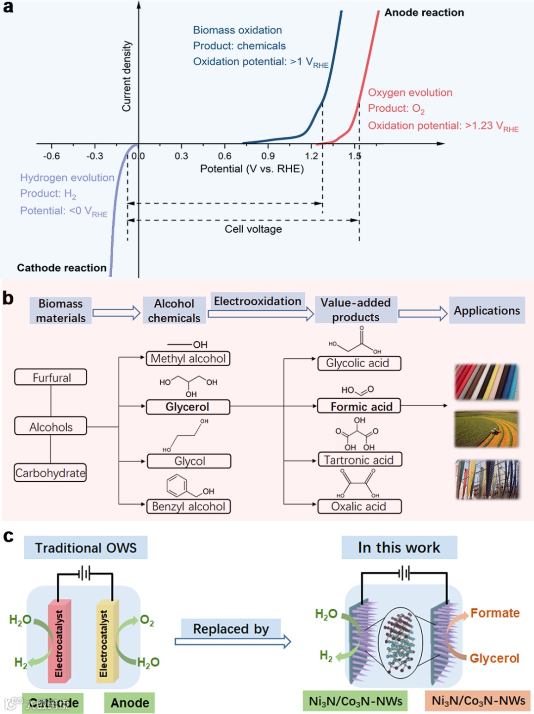 图一. Ni3N/Co3N-NWs作为双功能催化剂催化阳极甘油电氧化辅助阴极产氢。