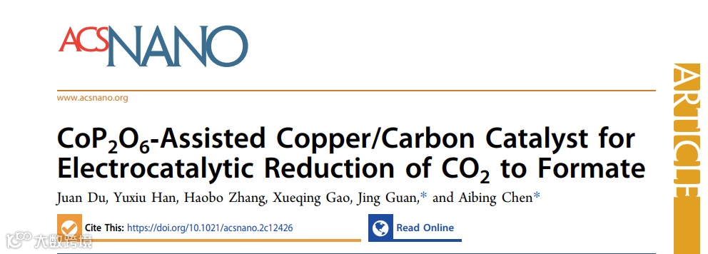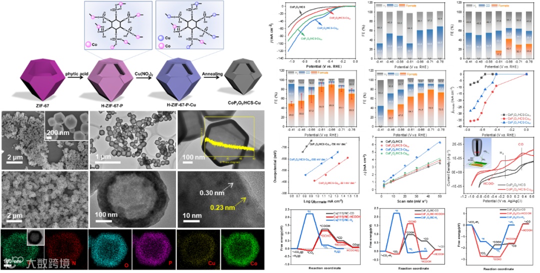 近日,来自河北科技大学的陈爱兵教授在国际知名期刊ACS Nano上发表题为“CoP2O6 assisted copper/carbon catalyst for electrocatalytic reduction of CO2 to formate”的研究论文。该论文基于碳框架和CoP2O6物种的特性,制备了具有精确可控铜含量的Cu和CoP2O6共锚定的N掺杂空心碳球催化剂用于电催化还原CO2制备甲酸。铜与钴的比例对催化剂的催化性能有重要影响。此外,实验结果和密度泛函理论计算表明,CoP2O6是促进甲酸盐生成的重要因素。