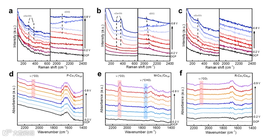 图4.(a)P-Cu1/CuNP,(b)M-Cu1/CuNP和(c)R-Cu1/CuNP在5 M KOH电解液中不同电位下CO2RR的原位拉曼光谱;(d)P-Cu1/CuNP,(e)M-Cu1/CuNP和(f)R-Cu1/CuNP在3 M KOH电解液中不同电位下CO2RR的原位红外光谱。