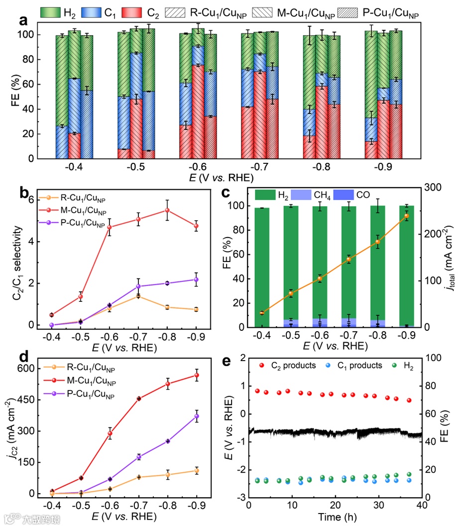 图2. 在5M KOH电解液中所合成催化剂在不同施加电位下的(a)C1产物、C2产物和H2的法拉第效率,以及(b)C1产物和C2产物的比例;(c)Cu-N-C在5 M KOH电解液中,不同电位下的FEC2和FEC1,以及总电流密度;(d)不同施加电位下的C2产物分电流密度;(e)在5 M KOH电解液中,M-Cu1/CuNP在恒定电流密度400 mA cm-2下的长期稳定性。