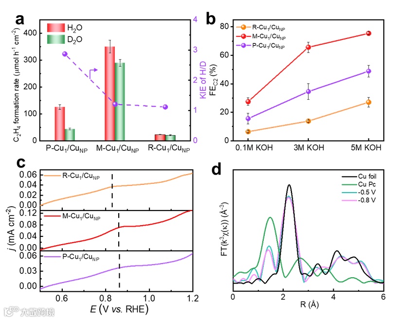 图3. 在以5 M KOH为电解液的流动电解池中P-Cu1/CuNP, M-Cu1/CuNP和R-Cu1/CuNP在-0.6 V时的KIE效应;(b)-0.6 V时P-Cu1/CuNP, M-Cu1/CuNP和R-Cu1/CuNP在不同浓度KOH电解液的FEC2;(c)P-Cu1/CuNP, M-Cu1/CuNP和R-Cu1/CuNP在0.1 M Na2SO4电解液中的CO电化学脱附实验;(d)5 M KOH电解液中,M-Cu1/CuNP在不同电位下的Cu K边原位FT EXAFS图谱。