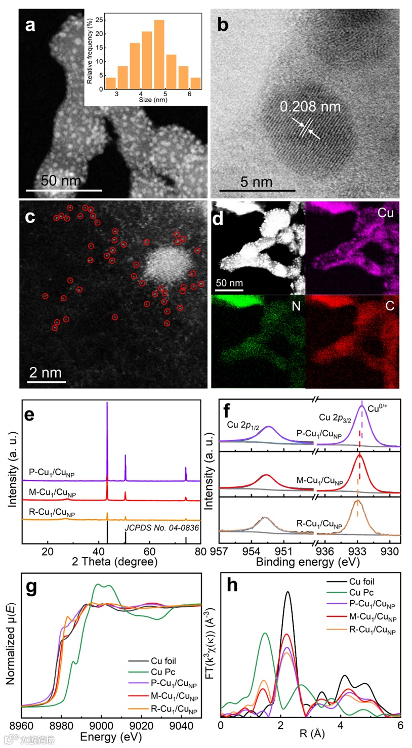 图1. M-Cu1/CuNP的(a)DF-TEM图(内部插入颗粒分布统计图),(b)HRTEM图,(c)球差校正的HAADF-STEM图和(d)EDS元素分布图。P-Cu1/CuNP, M-Cu1/CuNP和R-Cu1/CuNP的(e)XRD图谱,(f)Cu 2p XPS图谱和(g)Cu K边XANES图谱和(h)FT-EXAFS图谱。