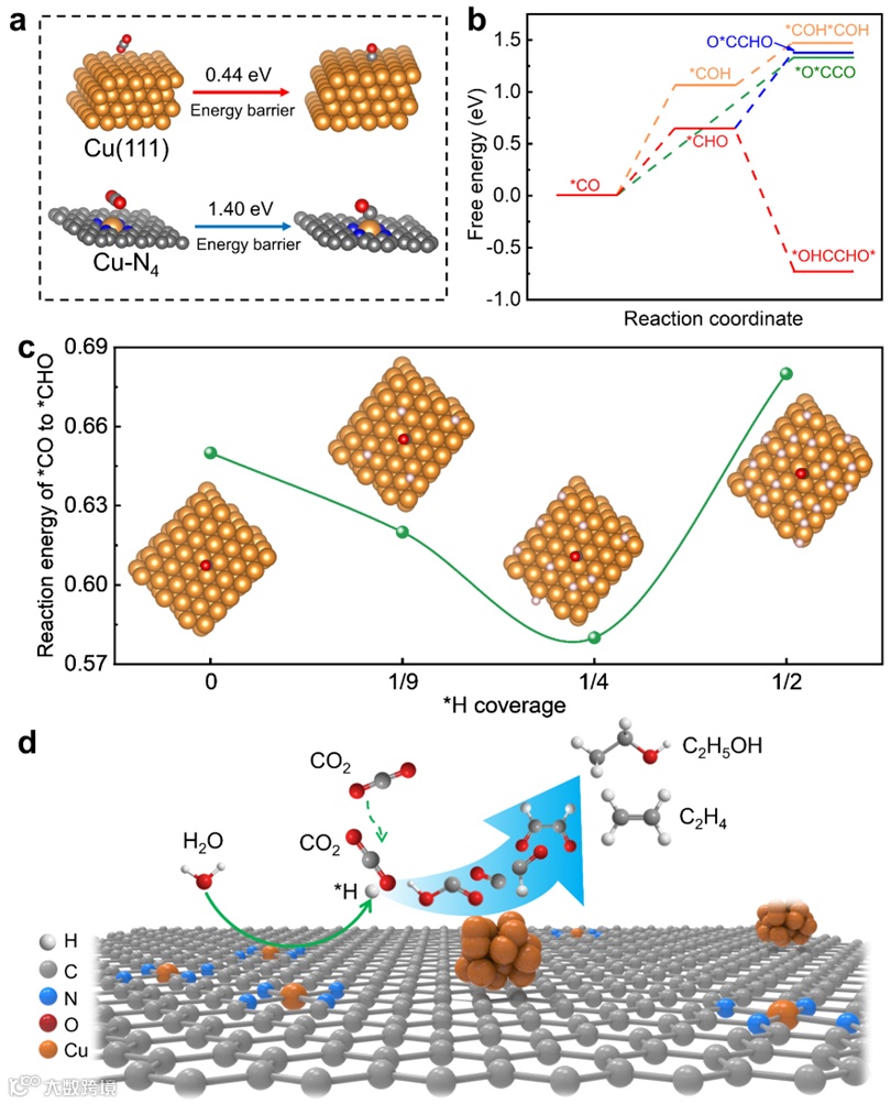 图5.(a)CO2在Cu(111)和Cu-N4上被转化为*CO的能垒;(b)CO2RR的自由能图,用于描述Cu(111)上的*CO进行可能的C-C偶联步骤;(c)CO氢化为*CHO在Cu(111)上的反应能随*H覆盖度的变化;(d)M-Cu1/CuNP上CO2RR到C2产物的反应机制。