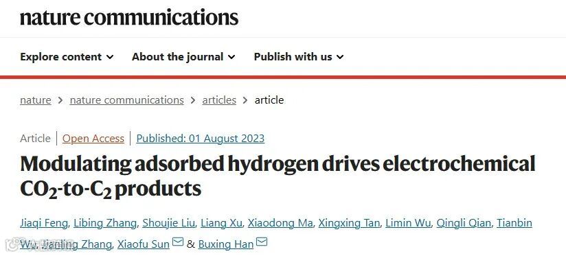 该研究以题为Modulating adsorbed hydrogen drives electrochemical CO2-to-C2 products”的论文发表在《Nat. Commun.》。冯佳奇博士为文章第一作者。此研究得到国家自然科学基金等项目的支持。