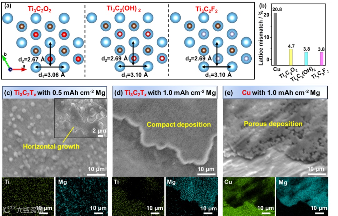 要点2:Ti3C2Tx MXene 与镁(002)具有超高的晶格匹配度,从而实现金属镁的水平外延沉积。