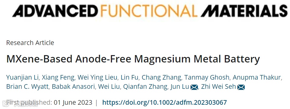 近日,新加坡科技研究局Seh Zhi Wei高级科学家和浙江大学陆俊教授采用MXene薄膜作为负极集流体,首次成功构建了无负极镁金属电池。理论模拟和实验结果表明Ti3C2Tx MXene表面丰富的官能团以及独特的晶体结构,能够引导金属镁的水平外延沉积并促进富含氟化镁的固态电解质层生成,从而实现了高度可逆的镁电镀/剥离行为。基于MXene的无负极金属镁电池可以稳定循环,并表现出五倍于常规镁金属电池的能量密度。相关研究成果“MXene-Based Anode-Free Magnesium Metal Battery ”为题发表在材料类国际顶级期刊Advanced Functional Materials上。此项工作的开展还得到了贵州大学付林老师,北京航空航天大学张千帆教授,上海科技大学刘巍教授,和Indiana University-Purdue University大学Anasori Babak教授的帮助。