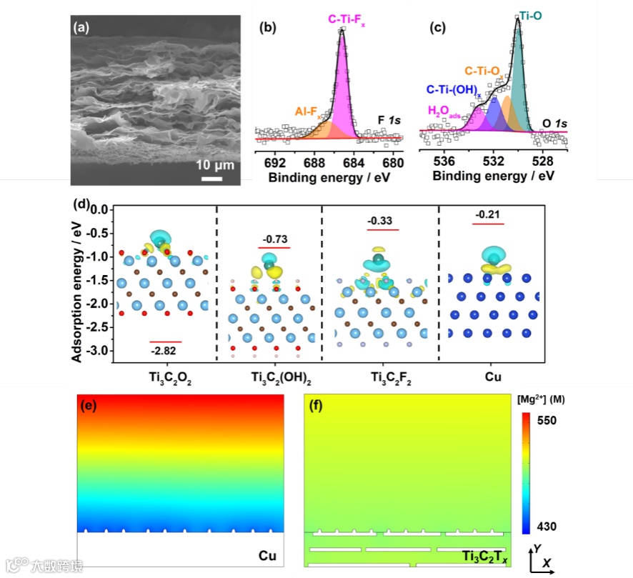 要点1:Ti3C2Tx MXene表面有丰富的-O和-F官能团,这些官能团具有很强的亲镁性,从而可以均匀化MXene电极表面的镁离子分布